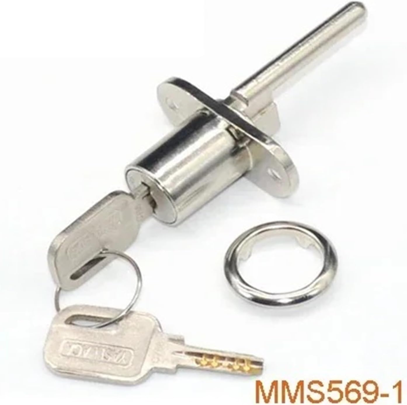 ate LocksItem:MMS569LockType: DrawerLockKeyType:FlatKeyMaterial:Zinc AlloyFinished:NoneKeycombination:Keyed DifferentNetWeight:80g / BagPackage:PPbagAccessories:Each Set: Lock*1,Key*2PCSMaterial:Steel,Finished:Nickel