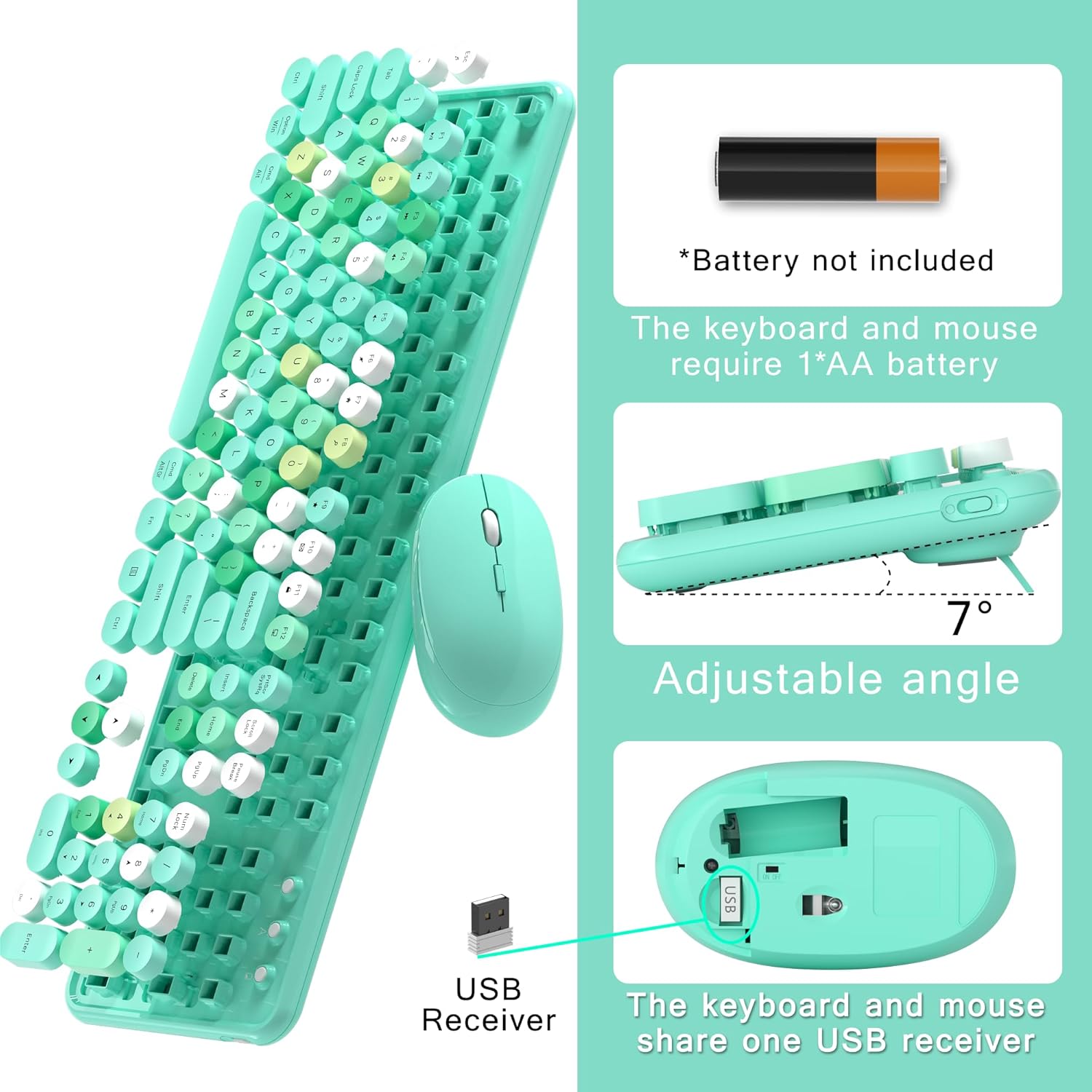 Colorful Wireless Computer Keyboard and Mouse Combo with Round Typewriter Keycaps, Retro Design, Power Switch, Ergonomic Design, 2.4GHz Wireless for Windows, Mac, PC(Dark Green)