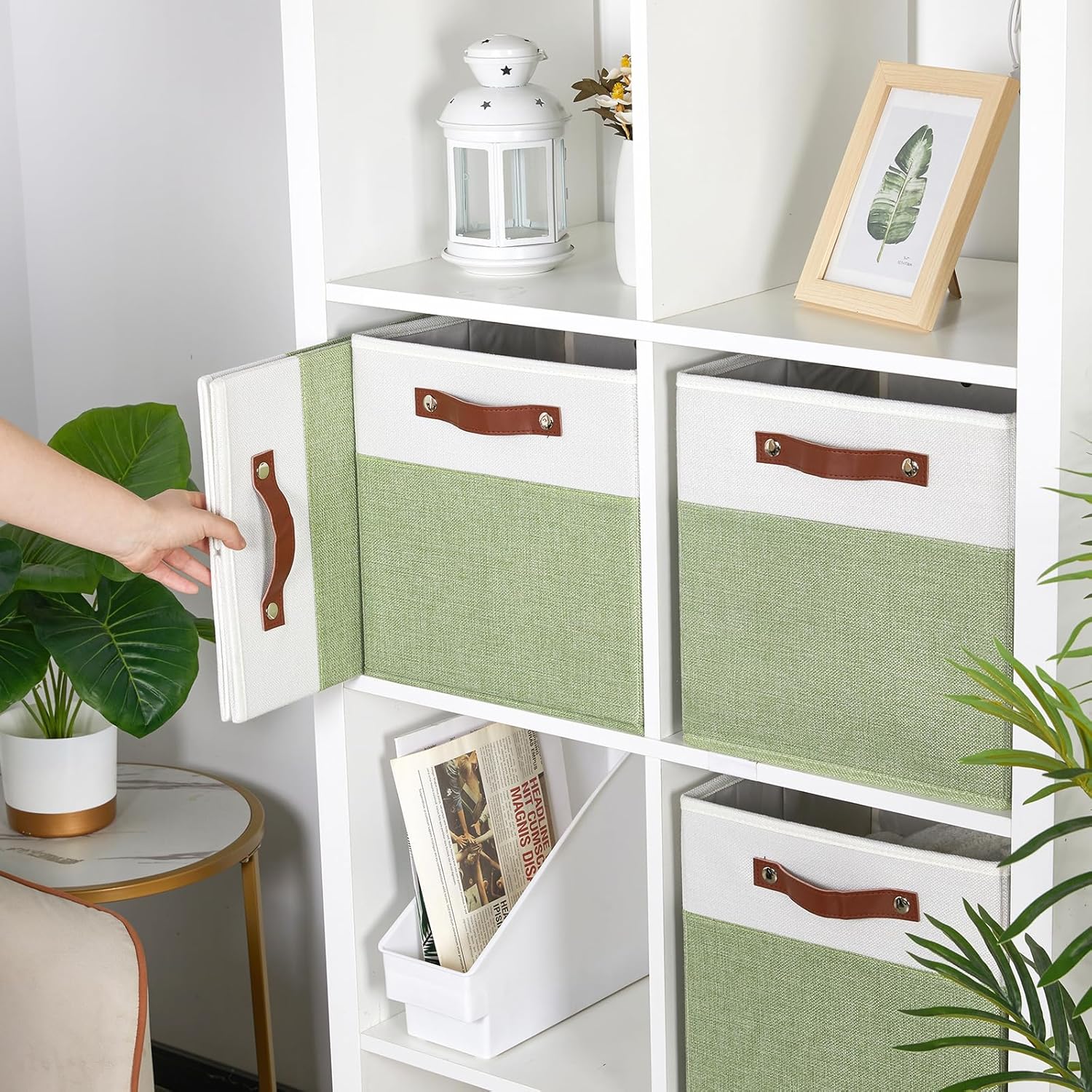 • 【Material】These cube storage bins are constructed of sturdy and attractive linen & cardboard with linen interior lining. The sturdy leather handles make it easy to carry or pull off and out of shelves.