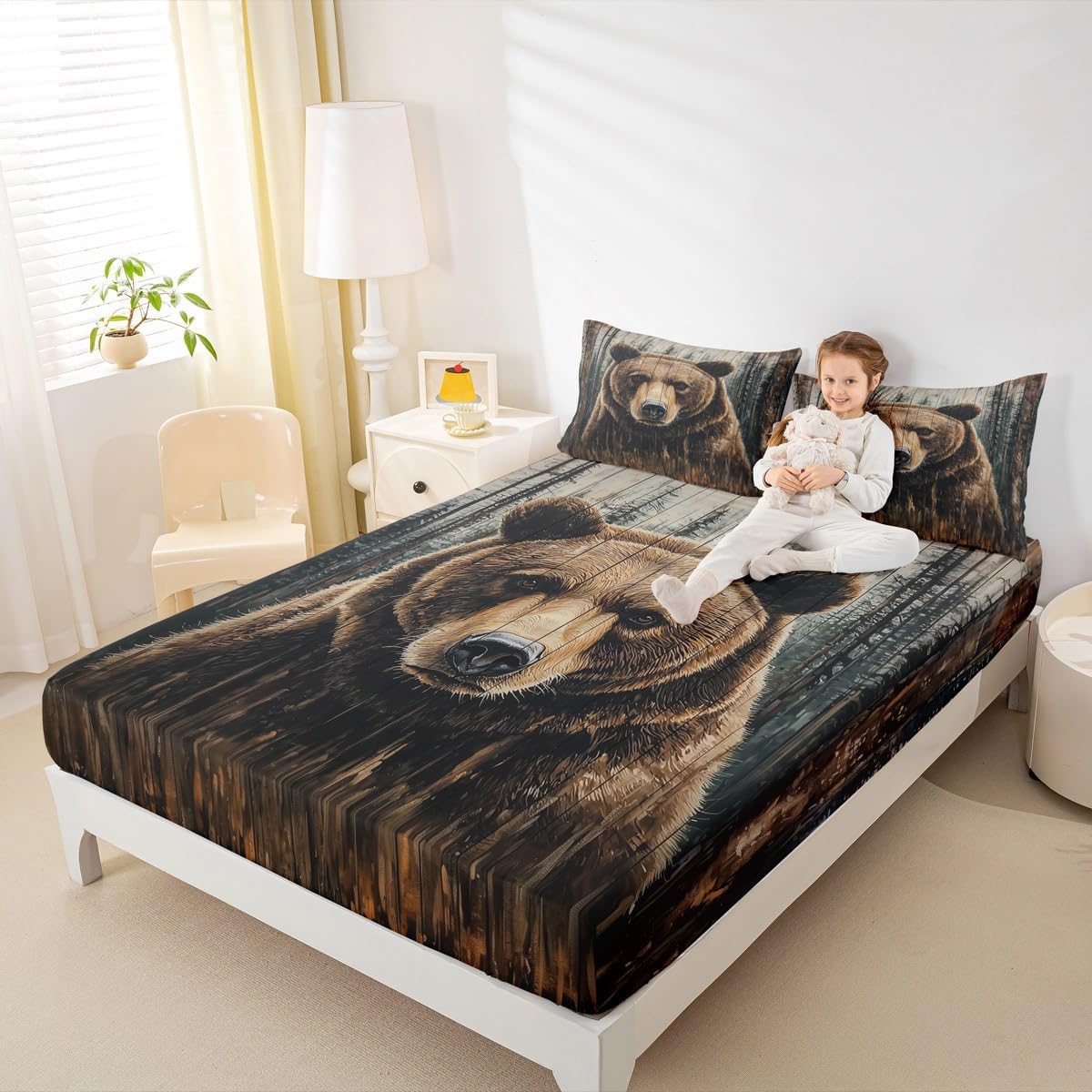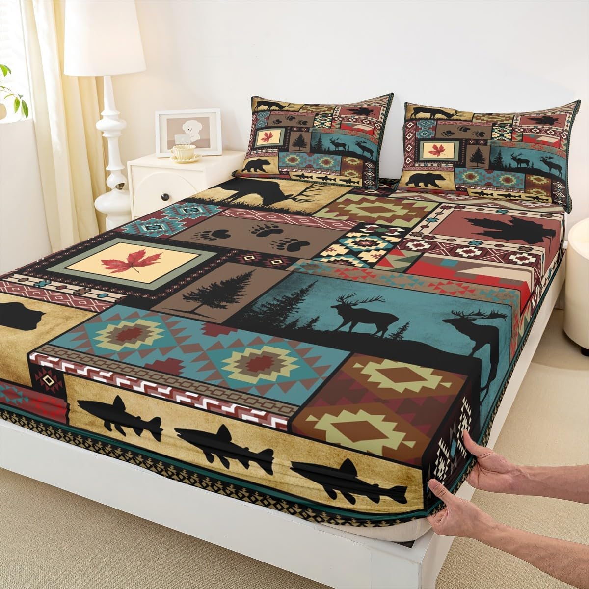 Feelyou Rustic Cabin Bed Sheets Set Full Size Retro Bear Bedding Lodge Farmhouse Bear Deer Deep Pocket Fitted Sheet Woodland Animals Vintage Breathable Soft Lightweight Microfiber, NO TOP Sheet