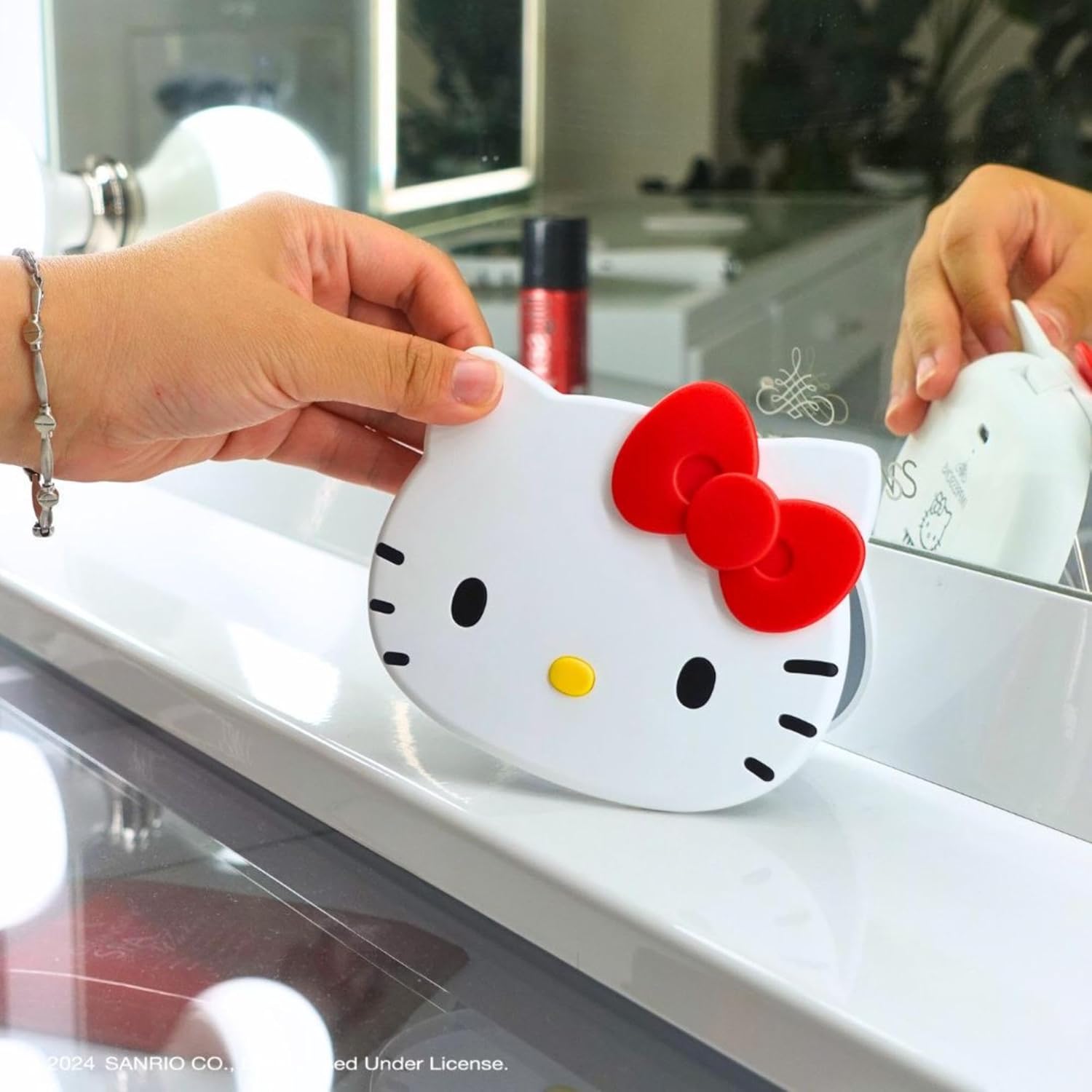 Impressions Vanity Hello Kitty Compact & LED Stand Mirror – Dual Purpose Beauty Essentials with Style, Functionality & Charm Your makeup routine deserves the best, and this will not only enhance your daily beauty rituals but also adorn your makeup desk with an extra touch of cuteness. It features the Hello Kitty's figural shaped design and a red bow on one ear. You can quickly fix your makeup, and hair or apply lipstick with its 3x magnification mirror which gives you a close up view for flawless makeup. The lighted magnifying mirror provides optimal lighting for visibility and flawless reflection. The travel makeup mirror is easy to open and close because of its magnetic closure, scratch and dust free for it's foldable option. The Hello Kitty LED desk mirror is a beautiful and useful combo. Its the symbol of the well-known Hello Kitty design with a yellow nose and red bow, making it a beautiful addition for any vanities. The unique touch sensor switch technology of the Hello Kitty LED Handheld Makeup Mirror is one of its most notable features. It is very user friendly due to the touch sensor makes it easy for users to control the LED lights with a simple tap. A magnetic ball standing base is included with the hand held mirror to allow for hands free use. You can easily and freely set the table mirror at various positions because of this adaptable base. Meet all your daily demands such as makeup, skincare, draw eyeliner, or apply mascara with this portable makeup mirror. The compact design of the foldable mirror makes it easy for on the go use.!! Every occasion or special day our handheld mirror with light plays a special role in your life and makes your life easy !!