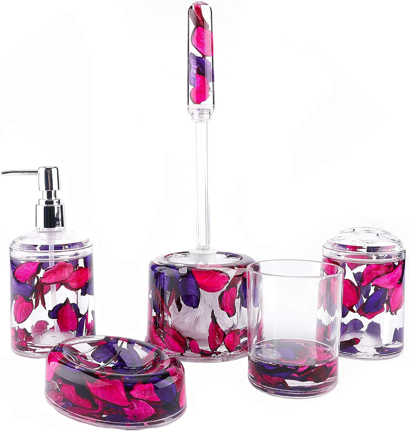 Welcome to your home of Locco Decor! It is time to replace your bathroom accessories with Locco Decor acrylic floating set. Our bathroom set offers a dynamic change to your bathroom and turns stationary objects into entertaining art pieces with floating motion. All of our fill-ins are hand-crafted with all-natural materials. The shells are hand-cleaned, fishes are hand-painted, and flowers are air-dried. Our workers put their maximum effort into creating your perfect decorations, bringing a clean, organized and elegant looking to your sweet home. All items are firmly sealed and free of heavy metal elements. Let the small objects brighten every morning in your life! What’s in the Box? Shell 1 Soap Dish (5.25" x 3.75" x 1.5"H) 1 Toothbrush Holder (2.75" x 2.75" x 4.75"H ) 1 Tumbler (3.5" x 3.5" x 3.9"H) 1 Soap Dispenser (2.75" x 2.75" x 7.75"H)