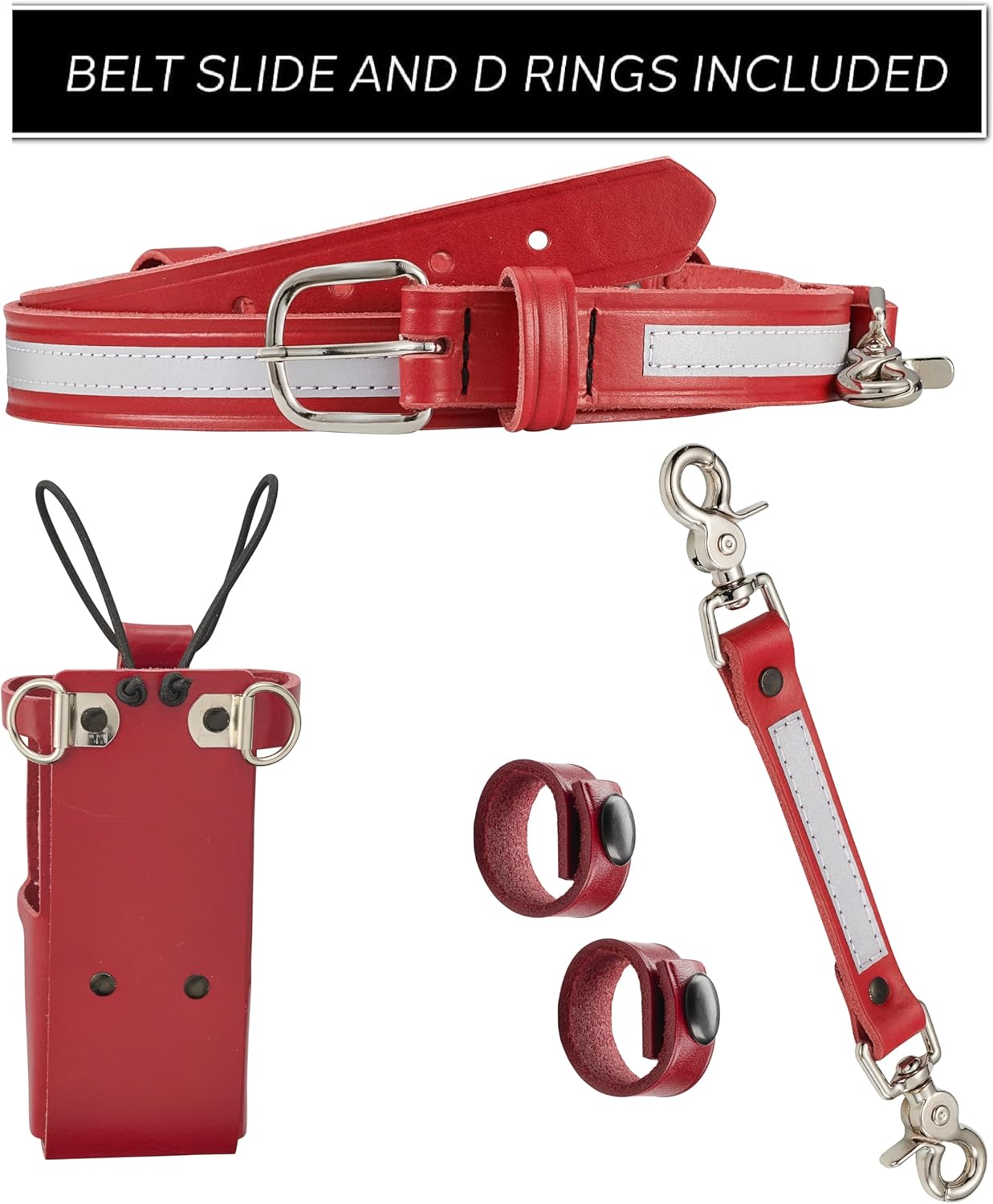 This red leather firefighter bundle with chrome snaps is designed to meet the rigorous demands of the job. This comprehensive set includes everything you need for secure and reliable radio management, all crafted from genuine red lether. It includes a radio holder that features a universal fit, has elastic bands to keep your radio firmly in place with strong fastening mechanism. Its radio strap is adjustable, and has a quick-release trigger snap for fast and easy access. Cord Keepers are lightweight and durable. It measures 4 ¼ x ¾ and fits all standard radio holsters. The anti-sway strap provides extra stability by preventing your radio from swinging or shifting during movement. Everything in the bundle is made out of high-quality genuine leather and drum-dyed, ensuring the red color permeates throughout the leather. Made in USA