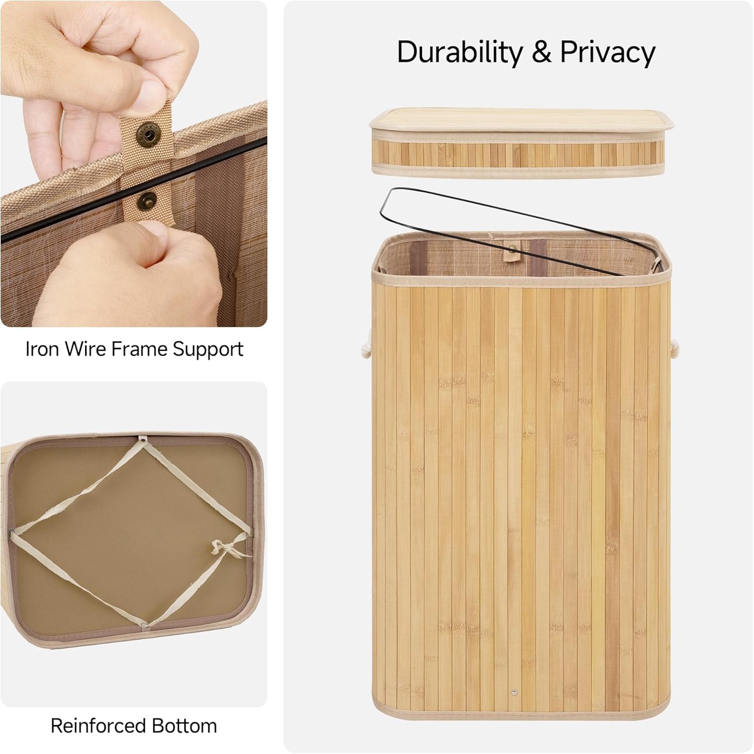• Natural Bamboo: Durable and stable bamboo construction with reinforced bottom and supporting metal ring ensuring long-lasting use without sagging.