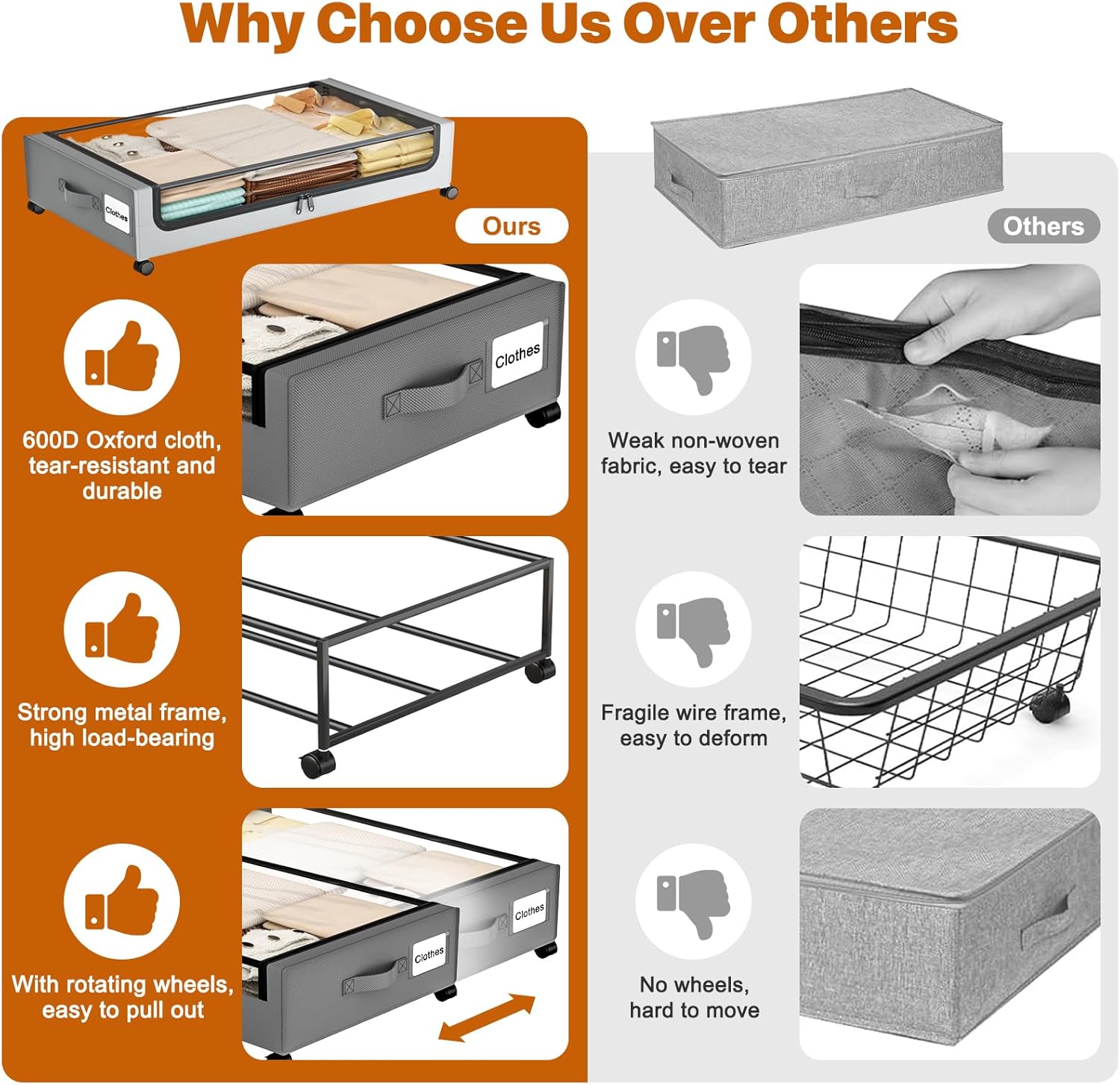 • Transparent Window & Label Design: The rolling under-bed storage bins feature transparent lid windows and label slots, making it easy to identify contents without opening multiple containers. This design helps prevent misstorage and ensures you can quickly locate items. The double zipper bottom and high-quality material keep dust, moisture, and dirt out, keeping your items clean and organized.