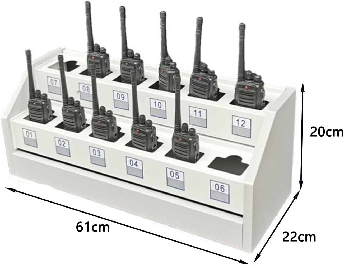 Introducing the Multi-grid Intercom Storage Rack, a versatile organizer designed to meet a variety of needs in industries such as firefighting, training, construction sites, security, visitor centers, and transportation. Constructed from sturdy steel plate material, this organizer boasts a strong load-bearing capacity and resistance to deformation, making it ideal for various workplaces.With multiple size options available, including 43*22*20cm, 52*22*20cm, 61*22*20cm, 42*32*28cm, 52*32*28cm, 80.5*22*20cm, 61*32*28cm, and 80.5*32*28cm, you can choose the perfect fit for your space and requirements. The rack features round holes that can accommodate walkie-talkies, keeping them neatly arranged and easily accessible. Additionally, number and name labels are included to assist with quick identification.The storage box includes ample space at the bottom to store a charger, allowing for convenient charging of walkie-talkies directly within the organizer. Whether you need a storage solution for work or organization, the Multi-grid Intercom Storage Rack is designed to streamline your operations. Make your daily tasks easier and more efficient with this practical and versatile storage solution.