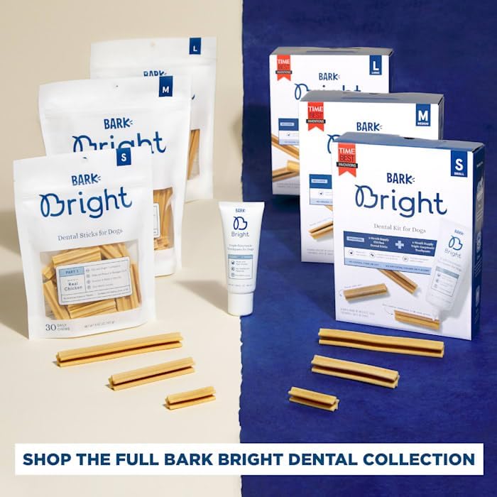 Cleaning your dog's teeth is as easy as one-chew-three! These BARK Bright Dog Dental Sticks, designed to be used with BARK Bright Dog Dental Toothpaste (sold separately), are an easy and effective way to help your dog deal with bad breath. The tough chews are made in the USA with real chicken for a flavor your dog will love. BARK Bright Dog Dental Chews scrub your dog's teeth and breaks down problem-causing debris. It's a daily routine that your dog will love. 30 chews for dogs 20lbs and under.